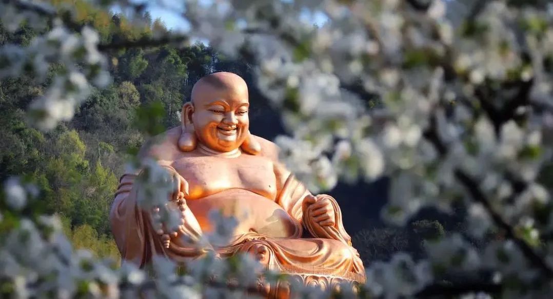 今天,人们走近雪窦山,远远就能看到笑口常开的大肚弥勒佛像。他呈比丘相,具菩萨意,挂布袋形,现佛慈眼。汉传佛教的弥勒造像从印度的天冠形象变成布袋和尚的形象,更加具备人性化、中国化的意味。宽大额头表示智慧无量,慈悲佛眼表示慈心无尽,双耳垂肩寓意长命富贵,笑容可掬表示施乐人间,袒腹露背表示真诚宽厚,大腹便便表示海量包容,左手握布袋寓意提起责任、放下烦恼,右手提佛珠表示把握未来乾坤,右腿曲立表示行动就在当下,左脚横放,脚趾上有“慈悲智愿行”,登上莲台,恭抱佛脚,即为亲近佛身,寓意“知足常乐”。慈能予乐即分享快乐,悲能拔苦即善于助人,智能增慧即传播智慧,愿能立志即树立理想,行能实践即付诸行动。整个大佛既是佛教以“和”为尚的“和尚”风范的体现,也蕴含着中国传统文化儒释道合一的思想。