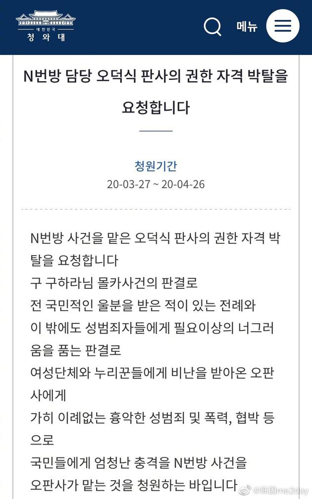 3月27日,青瓦台国民请愿公告栏上登载了请求剥夺负责“N号房”事件的吴德植法官权限的请愿文章。据悉,吴法官将于3月30日参加“N号房”加害者太平洋(16岁)的第一次公审。