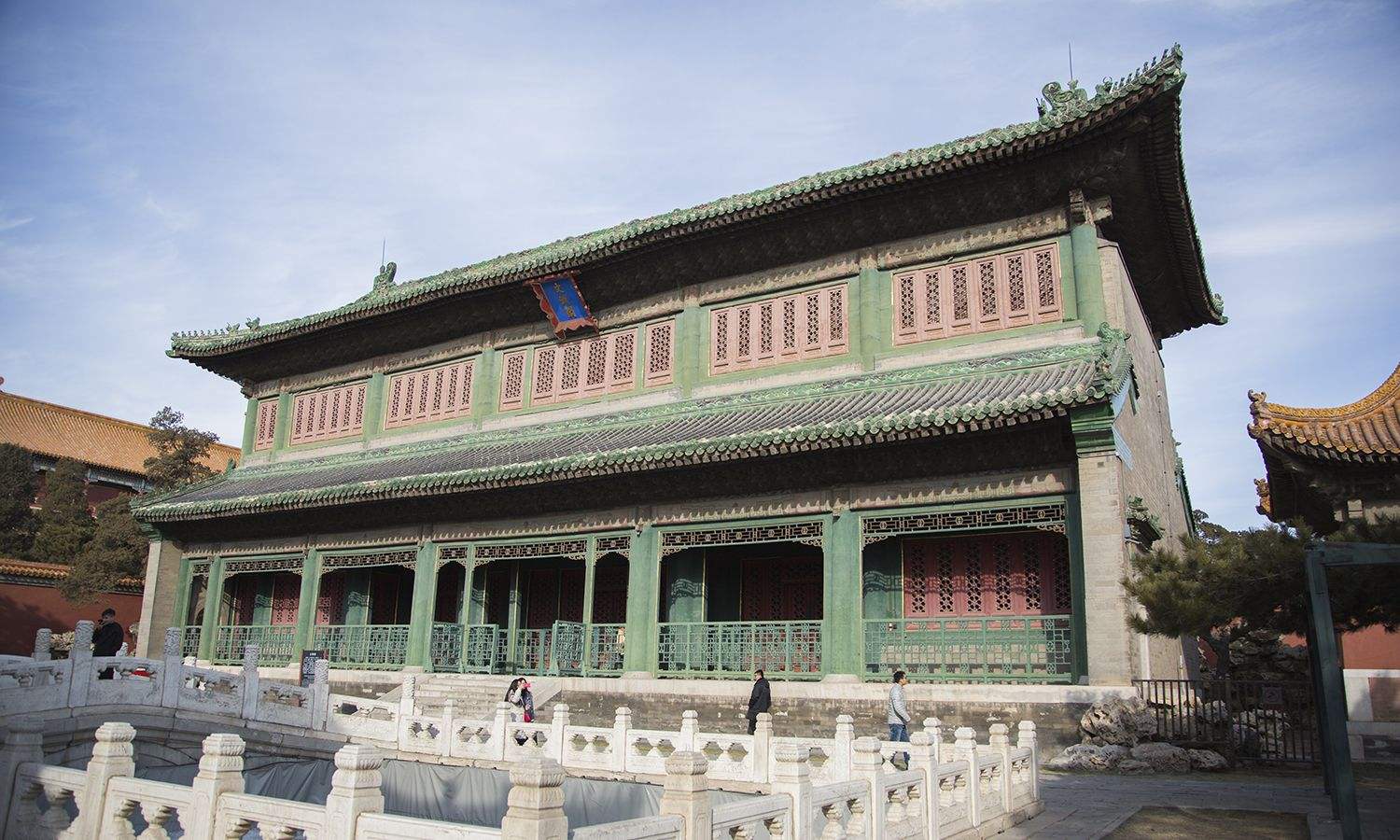 午门为故宫正门,平面呈“凹”字,可聚生气,中间洞开三门。石墩台上砌崇楼五座,正楼九开间,有“九五之尊”的象征意味。太和殿殿门上竖匾“太和殿”三字是康熙时大臣励杜讷的手笔。“太和”出自《周易》,意即天地万物和谐运行。