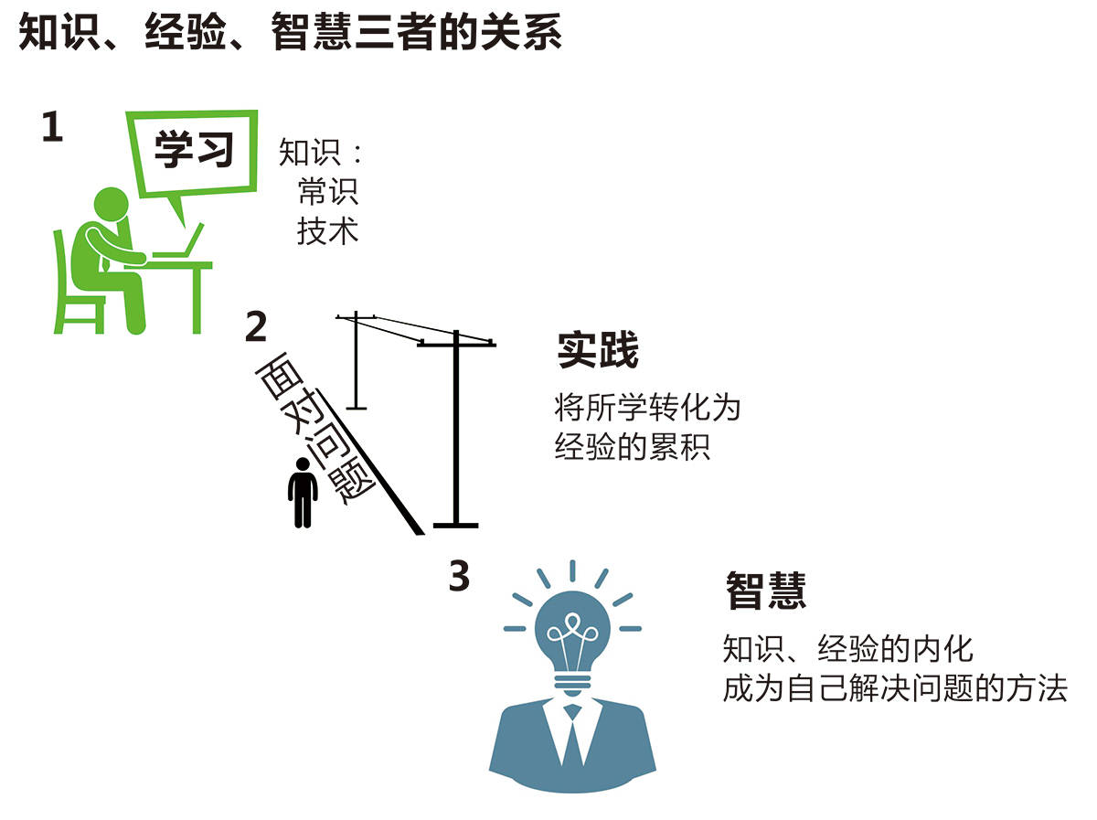 人生经历是一个增长知识、累积经验的过程,只有通过面对各种问题,才能有知识的成长并转为经验的累积,日后再遇到类似问题,就能应用累积的经验来解决,这就是“智慧”。如何将所学知识应用于日常,在遇到困境时能有更大的成长与收获,这就是“智慧”的展现,而让自己能在生存过程中有真正的受益。人生要明白“知识、经验、智慧”三者的关系,能让自己有真实的受益才能称做“智慧”的成长与获得。智慧是在自己处理每件事情的过程中,应用所学知识技术,或是通过吸收他人的经验教训,自己亲身实践获得的经验累积,再下一次遇到类似问题时,就能轻松面对并有很大的受益,每个人都是如此。若能从别人经历中吸取经验教训,就能节省很多不必要的过程,减少摸索时间和辛苦付出。人类社会不断发展,正是这种经由前人经验累积与教导,让后来者知道什么可以做、什么不能做、怎么做更好,逐步建立起了做人做事的准则。