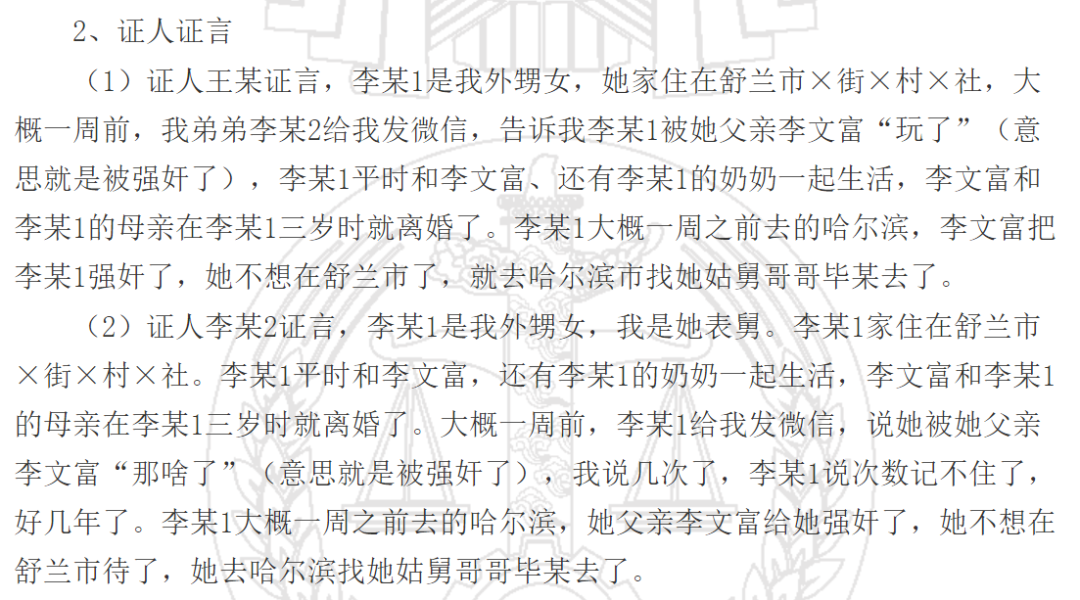 直到2019年,女孩的表舅收到女孩发来的微信,说自己被李某富强奸了,次数记不住,已经好几年了。女孩不想继续待在舒兰市,去哈尔滨找她姑舅哥哥毕某。