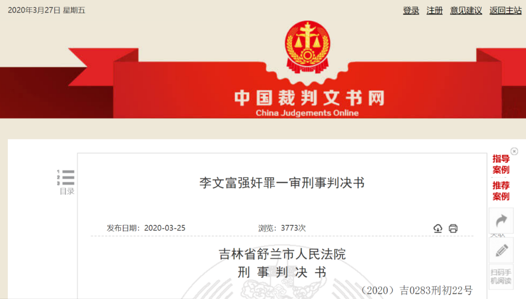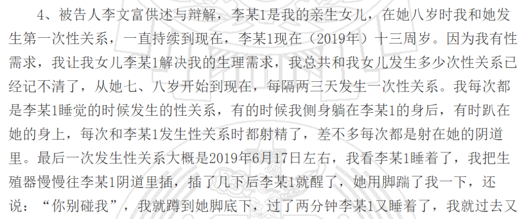吉林省男子李文富,从自己的亲生女儿8岁时开始,对其实施强奸,在长达6年的时间里,发生关系数百次!