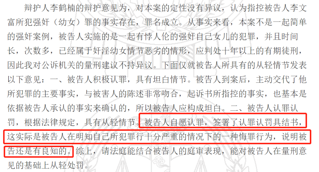 李某富指定辩护人指出,本案不是一起简单的强奸案,被告人实施的是一起有悖人伦的、强奸自己女儿的犯罪,并且时间长,次数多,已经属于奸淫幼女情节恶劣的情形,应判处十年以上的有期徒刑。
