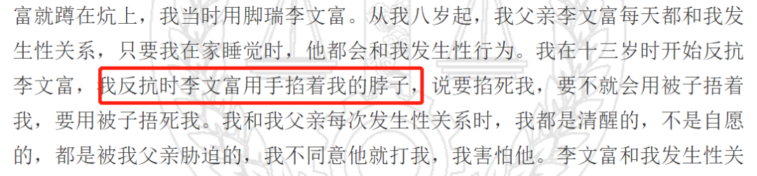 13岁时,小女孩开始反抗自己的父亲,用脚踢他。女孩反抗时,李某富就用手掐着她的脖子,说要掐死她,要不就用被子捂住她,要用被子捂死她。女孩称: “每次和父亲发生性关系,我都是清醒的,不是自愿的,都是被我父亲胁迫的,我不同意他就打我,我害怕他。”