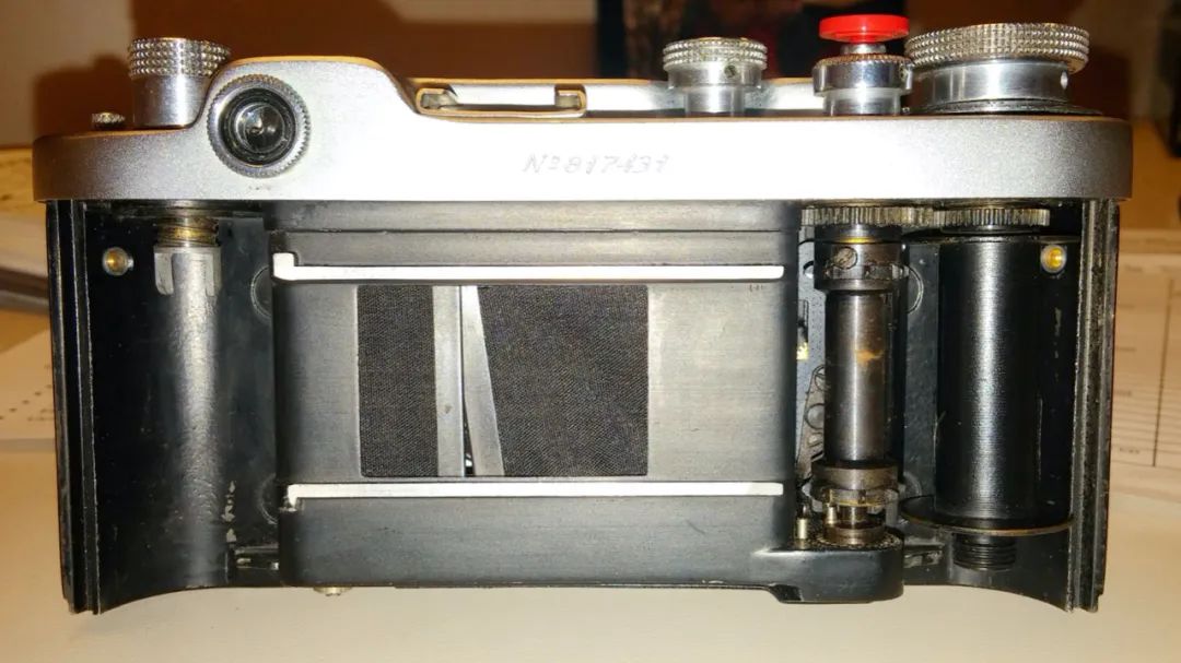 1955 年,Fed 向蔡司学习,重新设计了一款相机 Fed2,将取景、测距两个窗口合二为一,“开底盖”换胶卷方式也改为接近现代的开后盖方式(见图04),方便了许多,并增加了取景器屈光度调节等功能。