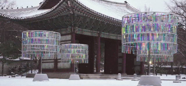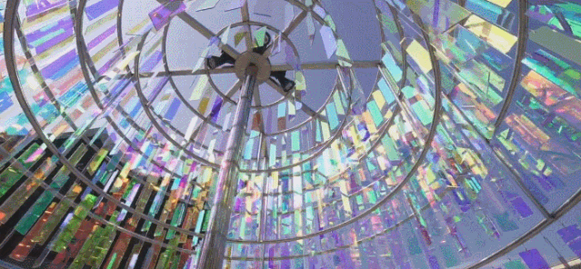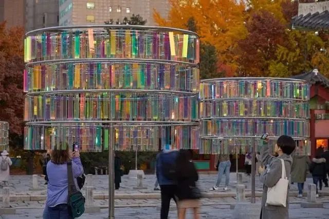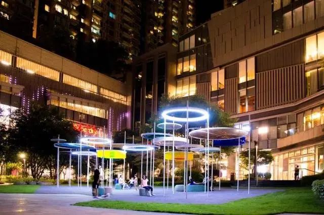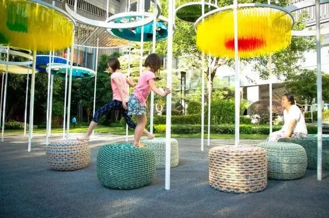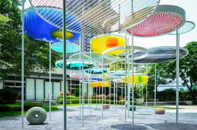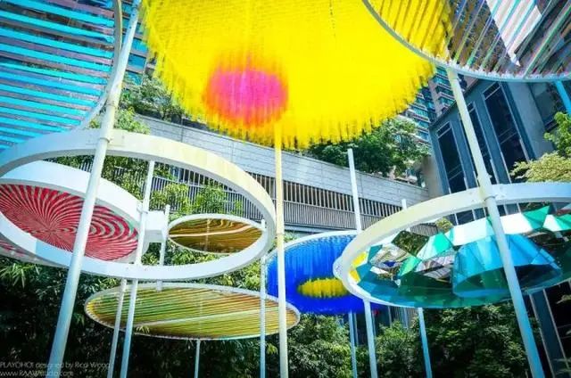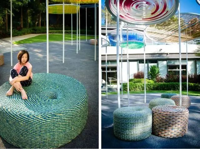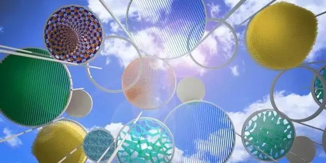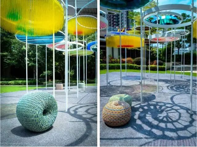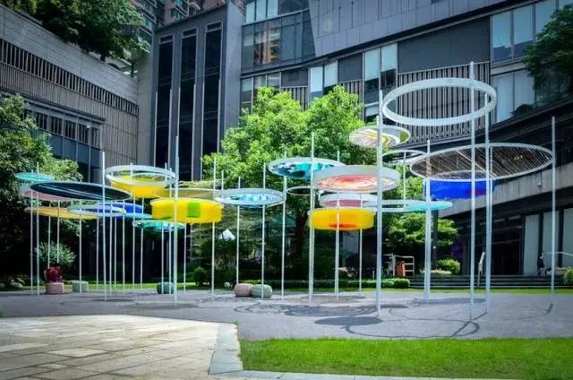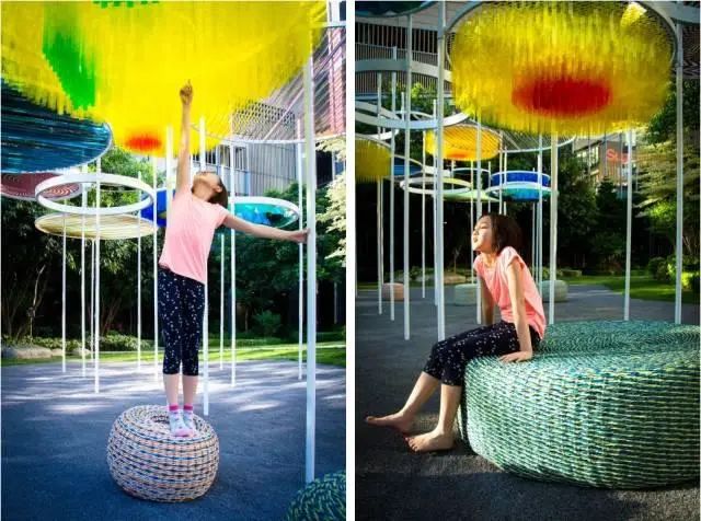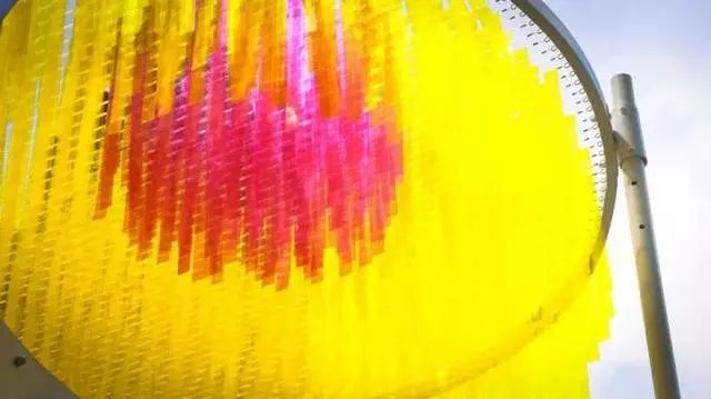 悠酷凉亭以二十八个不同大小和物料做成的圆盖子立在柱子上,风晃动了圆盖子上的条子,条子上的漂亮颜色把夕阳折射出七彩的影子在草地上。亭子凝固了时间,气氛,把途人的脚步减慢了,停下了,让人坐下来,躺下来,休息下来,看看那天空中凝固着的那彩色的空气。