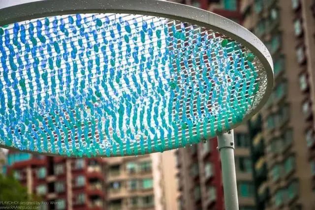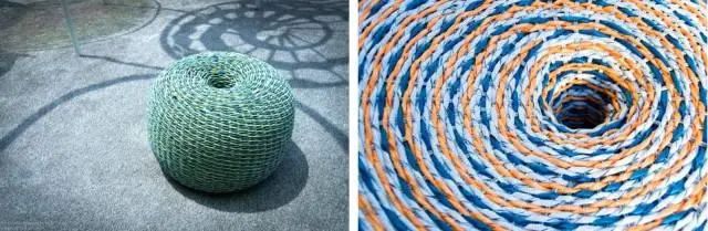 该装置经由数字化设计,再由技能娴熟的手艺人亲手编织。其连续的外表面全部采用百分百可回收高密度聚乙烯(HDPE)打造。