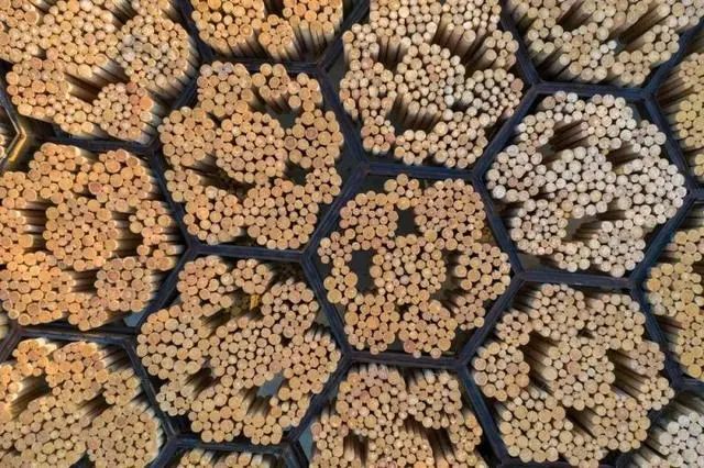 ▼7根钢柱的顶部,顶棚原木集束在六角形耐候钢模块结构的圆孔中