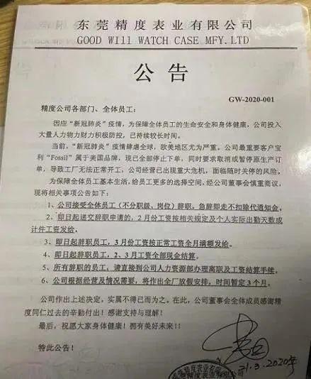除了服装、制鞋、玩具等外贸依存度很高的产业,其他产业也未能幸免。3月21日,东莞“精度表业”发布公告,宣布全厂放假3个月,并劝员工另谋高就。