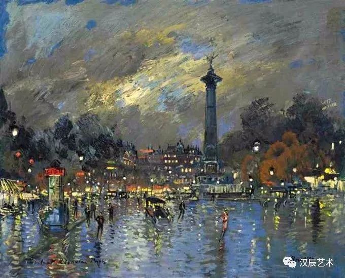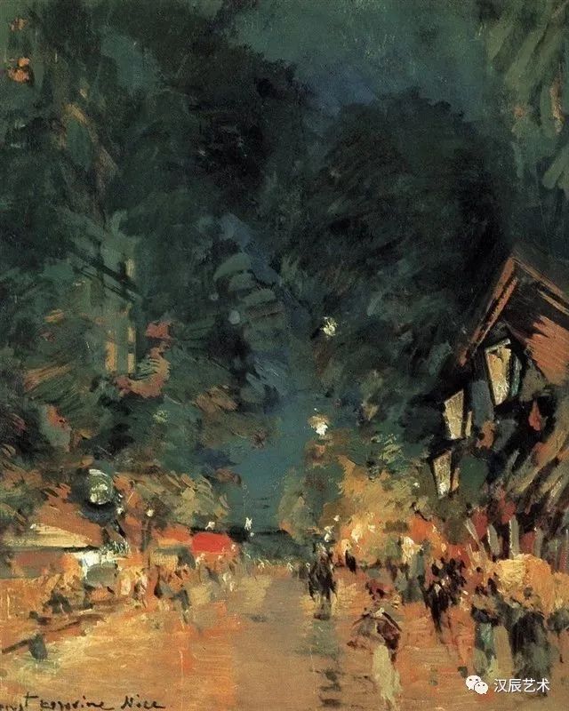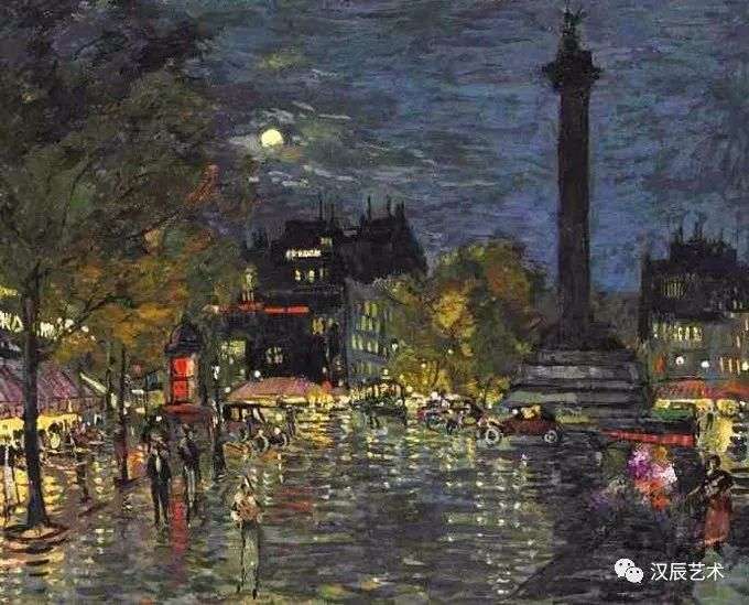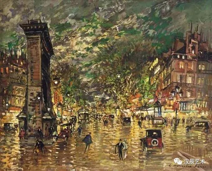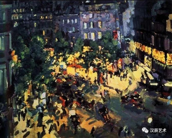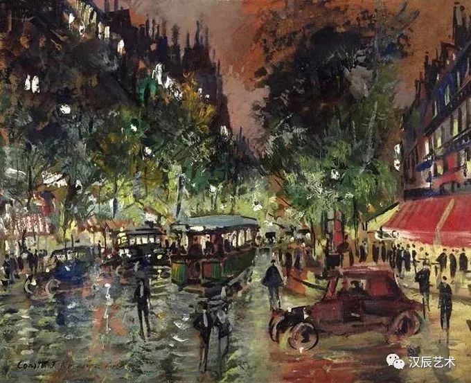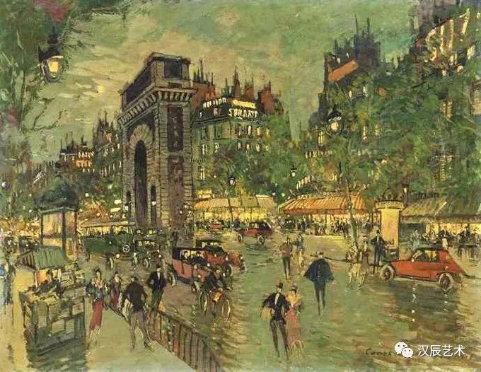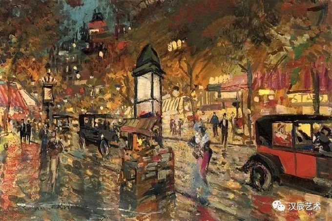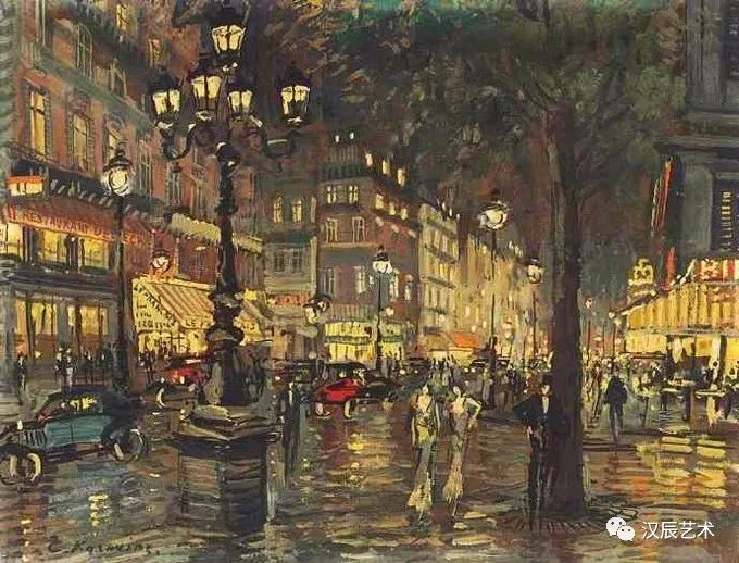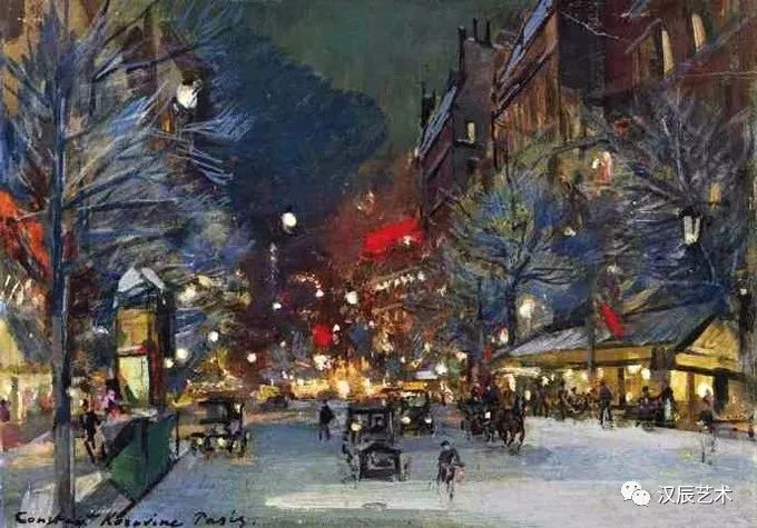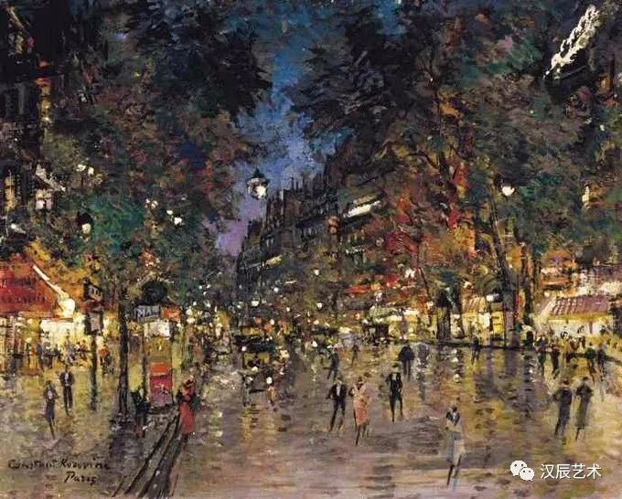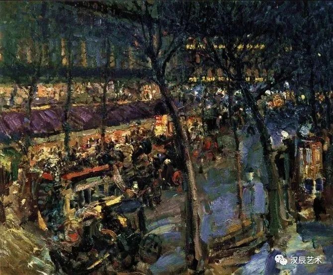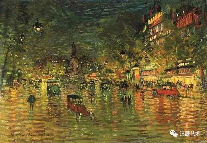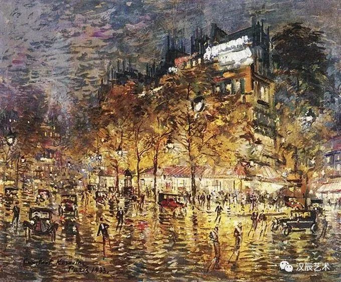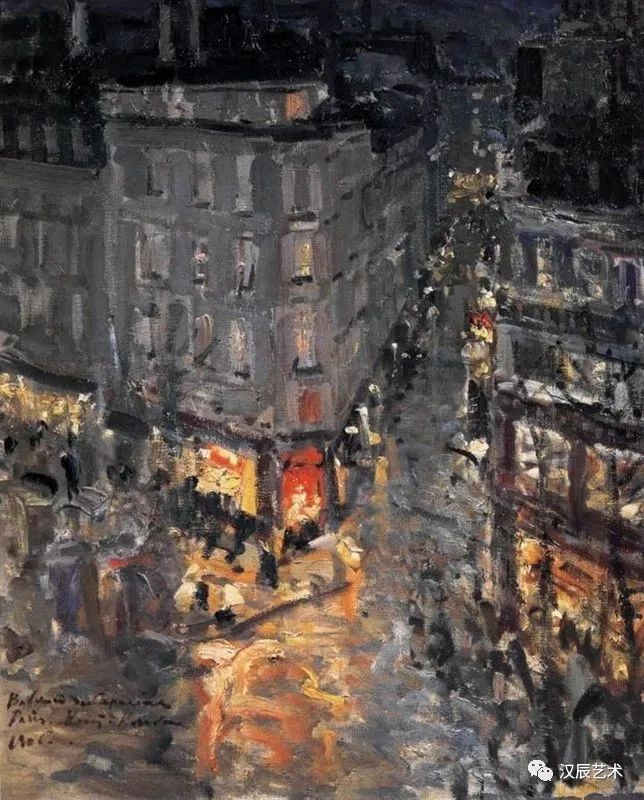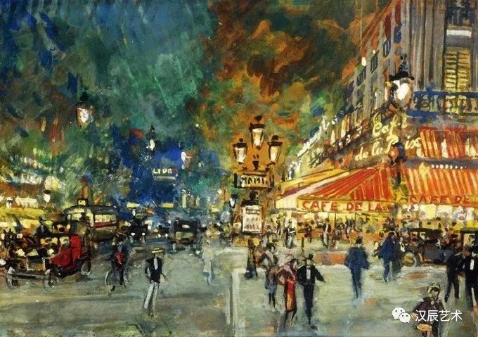 作品《夜巴黎》创作于1908年的。在19世纪90年代,柯罗文创作灵感均来自巴黎。他描绘了昏黄灯光下的巴黎街道,或是清晨空旷的街头。