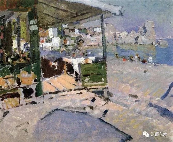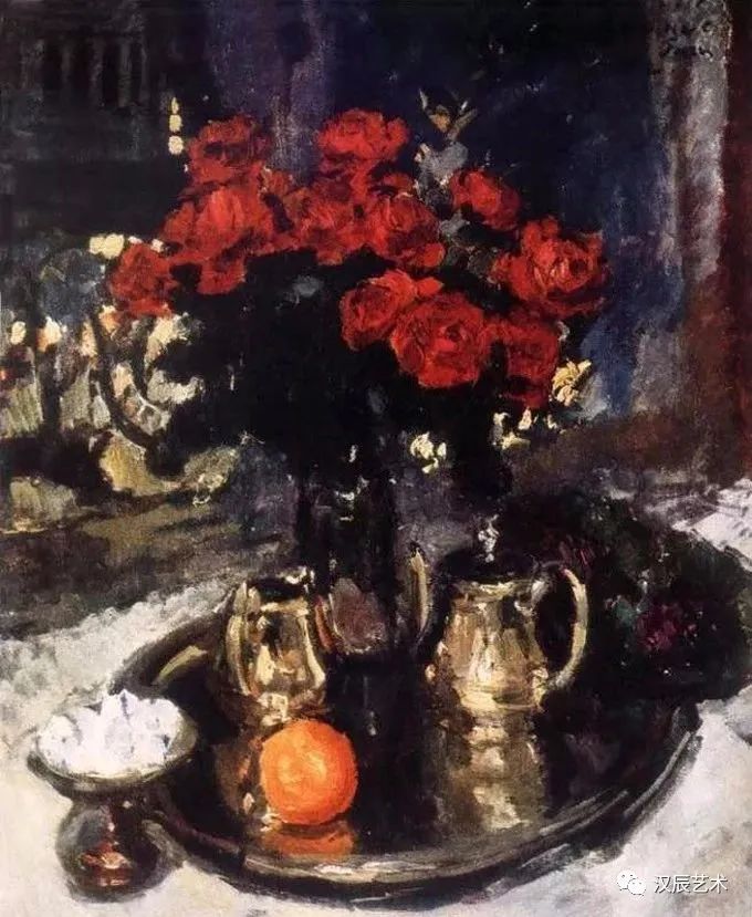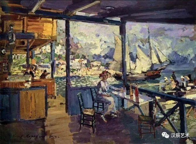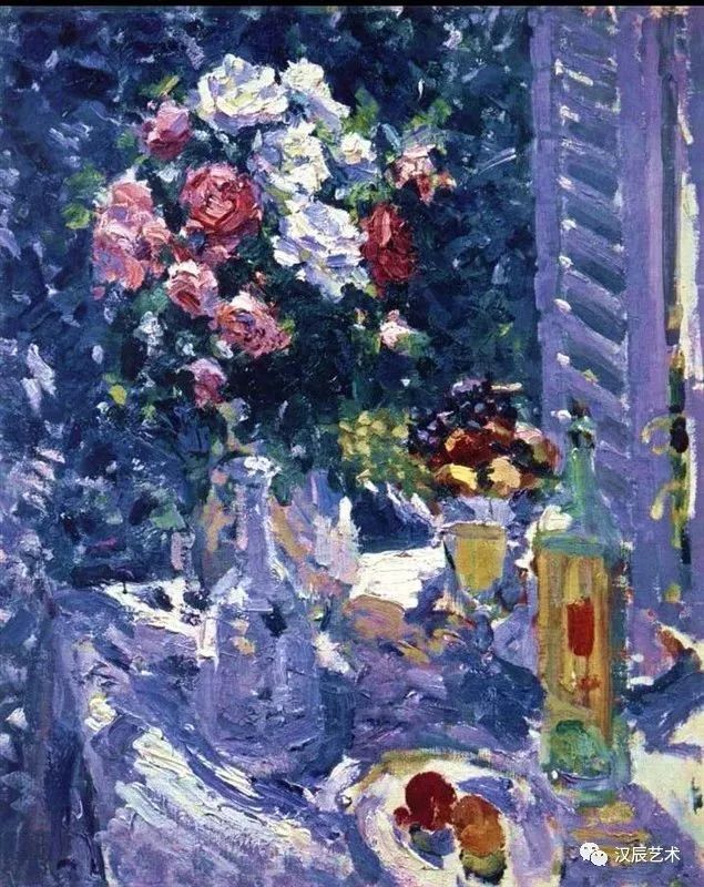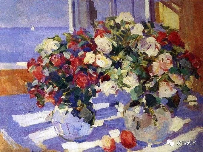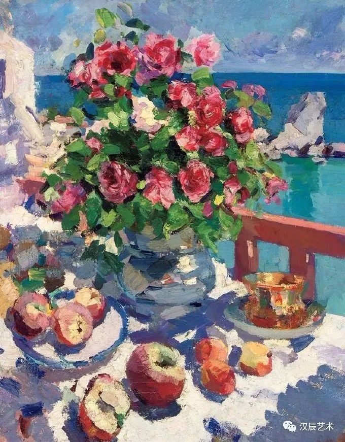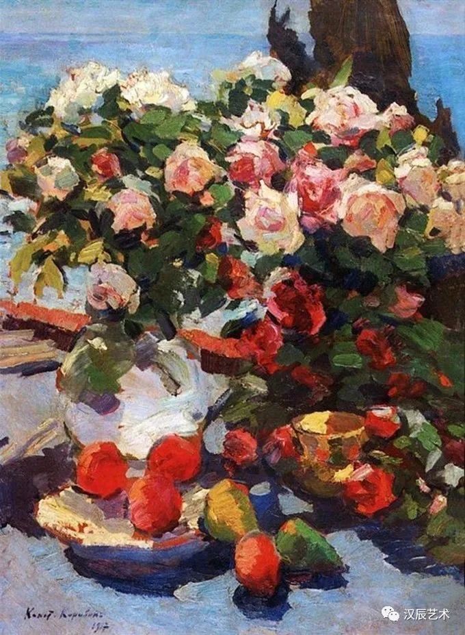 在柯罗文高度追捧的克里米亚时期创作的这些作品中,回顾了他最成功的静物之一,《玫瑰和苹果》(1912年,莫斯科国家特列季亚科夫画廊)。照射的光芒,粉红色的玫瑰和蓝色的大海,Korovin表达了他创作的核心情绪:...生活的美丽和快乐。重新创造这种快乐是我绘画的本质,我画的每件画布的每一部分,我的自我....