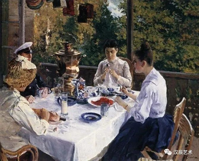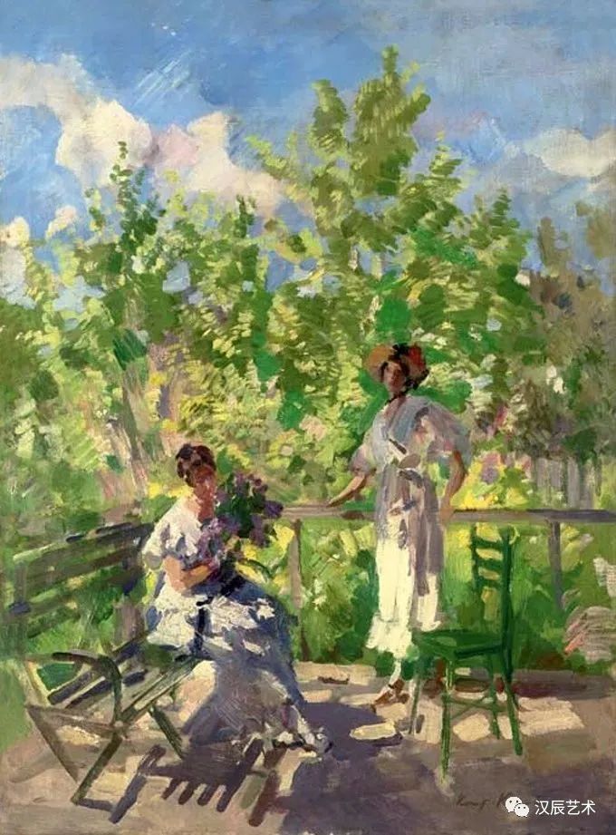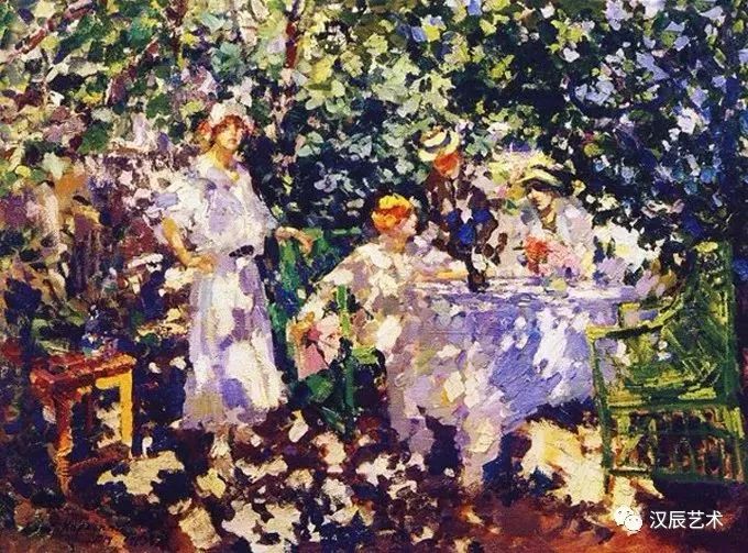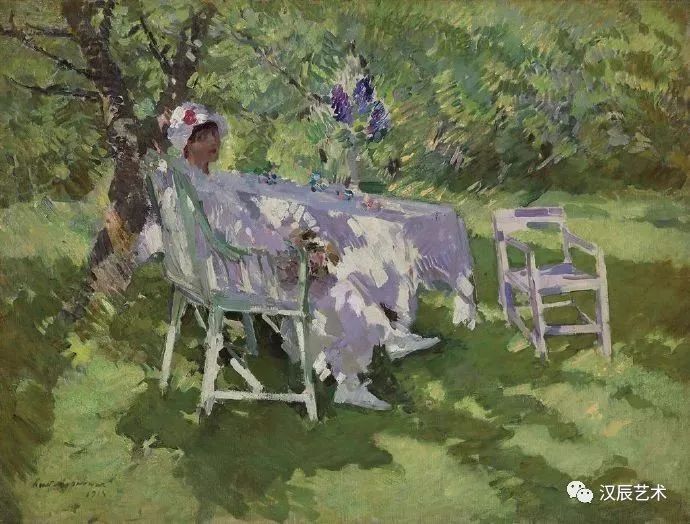 柯罗文进一步实验了一个坐在花园里的白色女士的颜色和光线的相互作用。穿着白色衣服的中心人物照亮了构图,激发了周围树木和草坪上的苹果绿色色调。桌布上的白色和柯罗文巧妙地使用树木叶子中的对比纹理,进一步加强了效果。这些缩写的笔触也可以在科罗温1916年的“露台”中看到,其中柯罗文使用相似的组成元素,来创造自然阳光的辉煌。