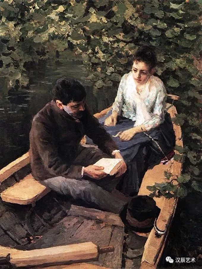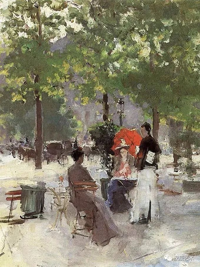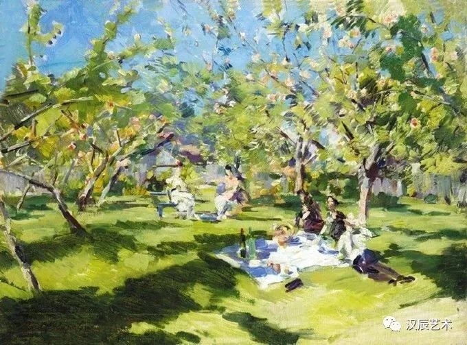作品《在花园里》浸润在光影中的形象是印象派画家最爱的主题。在这幅作品中,我们的注意力没有被人物或者物体吸引,而是完全集中五颜六色的生动光影上。面容与花朵难以分辨,而绿色的长椅似乎变成树叶的延伸。