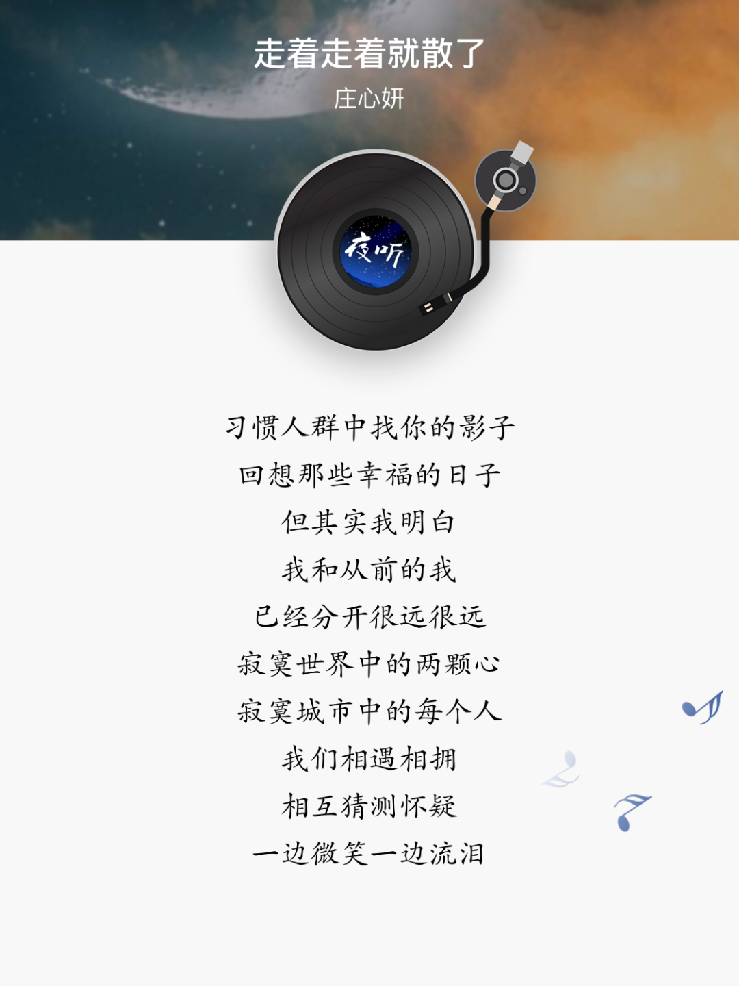 今天为大家分享的这首歌,是庄心妍唱的《走着走着就散了》。