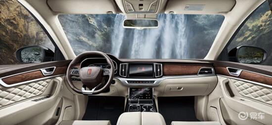 途昂的内饰仿佛和红旗HS7有异曲同工之妙,木纹饰板和菱形缝线皮革,以及双屏中控的布局都有些许神似,只是空调控制区为实体按键样式,并且空调出风口的扇叶造型上有一些区别。