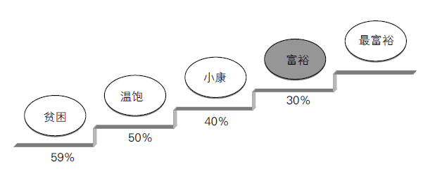 根据联合国粮农组织提出的标准,恩格尔系数在59%以上为贫困;50%-59%之间为温饱;40%-50%之间为小康,30%-40%之间为富裕,低于30%为最富裕。