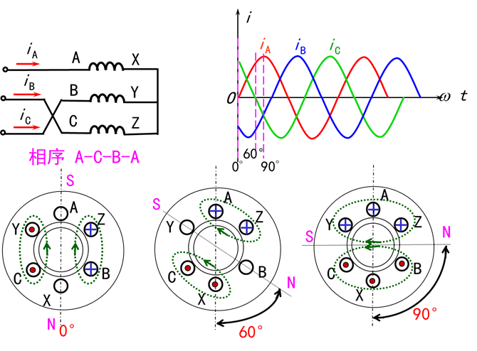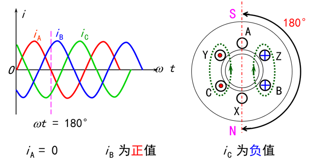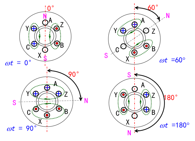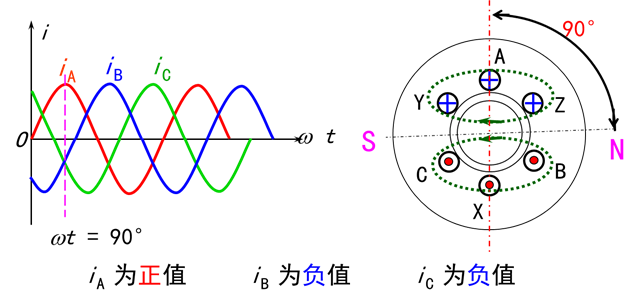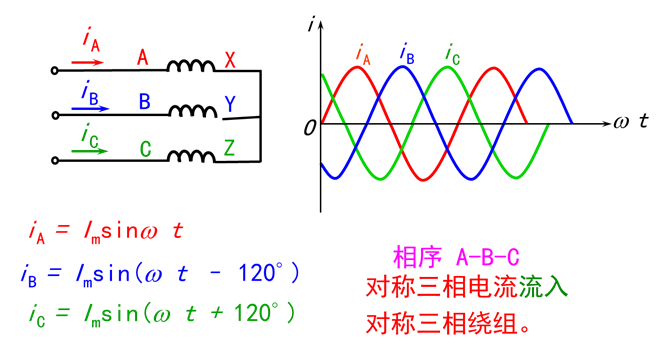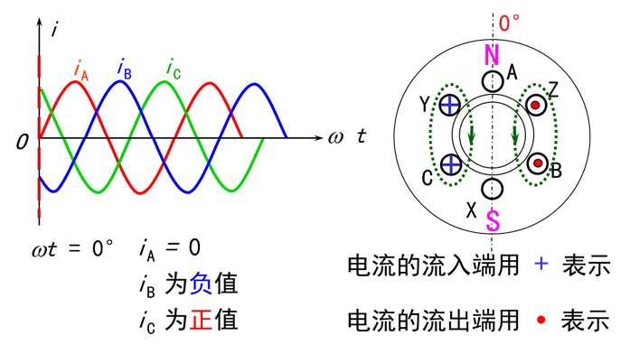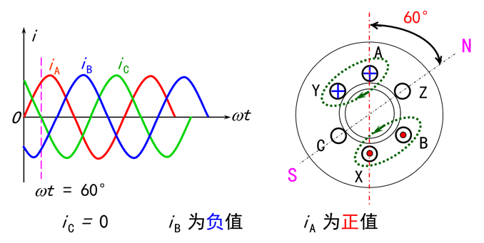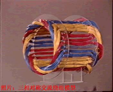 空间相差 120°角的三相绕组,通入对称三相电流时,产生的是一对磁极的旋转磁场,当电流经过一个周期变化时,磁场也沿着顺时针方向旋转了一周(在空间旋转的角度为360°)。