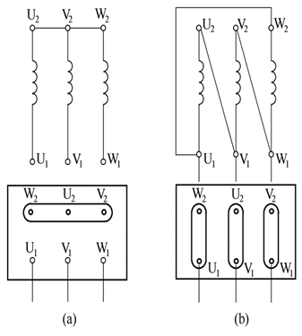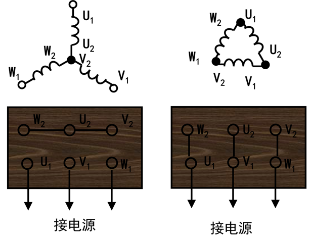 定子绕组是三相电动机的电路部分,三相电动机有三相绕组,通入三相对称电流时,就会产生旋转磁场。三相绕组由三个彼此独立的绕组组成,且每个绕组又由若干线圈连接而成。每个绕组即为一相,每个绕组在空间相差120°电角度。线圈由绝缘铜导线或绝缘铝导线绕制。中、小型三相电动机多采用圆漆包线,大、中型三相电动机的定子线圈则用较大截面的绝缘扁铜线或扁铝线绕制后,再按一定规律嵌入定子铁心槽内。定子三相绕组的六个出线端都引至接线盒上,首端分别标为U1, V1, W1,末端分别标为U2,V2, W2。这六个出线端在接线盒里的排列如下图所示,可以接成星形或三角形。