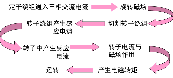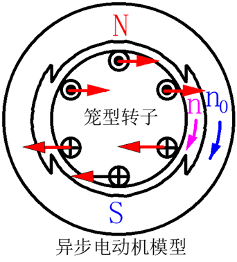 原理:定子旋转磁场以速度n0切割转子导体感生电动势(发电机右手定则),在转子导体中形成电流,使导体受电磁力作用形成电磁转矩,推动转子以转速n顺n0方向旋转(电动机左手定则),并从轴上输出一定大小的机械功率。(n不能等于n0)。