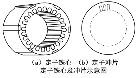 异步电动机定子铁心是电动机磁路的一部分,由0.35mm~0.5mm厚表面涂有绝缘漆的薄硅钢片叠压而成,如下图所示。由于硅钢片较薄而且片与片之间是绝缘的,所以减少了由于交变磁通通过而引起的铁心涡流损耗。铁心内圆有均匀分布的槽口,用来嵌放定子绕圈。