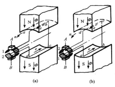 从以上的分析可以看到,要使线圈按照一定的方向旋转,关键问题是当导体从一个磁极范围内转到另一个异性磁极范围内时(也就是导体经过中性面后),导体中电流的方向也要同时改变。换向器和电刷就是完成这个任务的装置。在直流电动机中,换向器和电刷把输入的直流电变为线圈中的交流电。可见,换向器和电刷是直流电机中不可缺少的关键性部件。