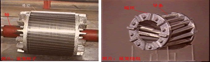 如果用的是铜料,就需要把事先做好的裸铜条插入转子铁心上的槽里,再用铜端环套在伸了两端的铜条上,最后焊在一起,如图(b)所示。如果用的是铸铝,就连同端环、风扇一次铸成,如图(c)所示 。笼型转子结构简单、制造方便、是一种经济、耐用的电机,所以应用极广。