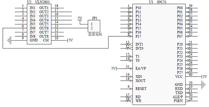 图8是使用TX-1C实验板做直流电机扩展实验时的硬件连接图,电机扩展板独立于TX-1C实验板,电机扩展板上使用5V直流电源,在做本实验时,两电源需要共地。电机扩展板上用一个达林顿反相驱动器ULN2803驱动电机,这里仅驱动一路电机,电机的一端接+5V电源,另一端接ULN2803的OUT6引脚,ULN2803的IN6引脚与单片机的P1.7相连,通过控制单片机的P1.7输出PWM信号就可控制直流电机的速度与启停。