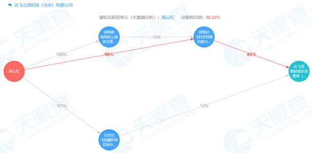 一方面,天眼查信息显示,高云红为达飞云贷的经理,对后者的持股比例达到92.22%。与达飞控股公告所指的“拥有达飞云贷92.2%股权的‘高先生’”一事相符。