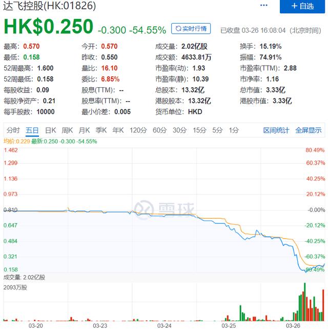 在达飞云贷被立案的消息传出后,达飞控股股价暴跌。截止3月26日收盘,达飞控股收盘价为0.25港元,下跌54.55%,总市值为3.33亿港元。自3月23日起4个交易日累计跌幅约80%。