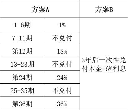 吴翠还告诉《商学院》记者,达飞云贷出具了A、B两种兑付方案。其中,A方案分为36期(一期为一个月)兑付,仅在第一年的前6个月内连续按月回款,此后第2年、第3年都是按年回款。具体情况为:1-6期兑付本息的1%;7-11期不兑付;第12期兑付18%;13-23期不兑付;第24期兑付24%;25-35期不兑付;第36期兑付36%。B方案则是3年后一次性兑付本金,并按照6%付息。