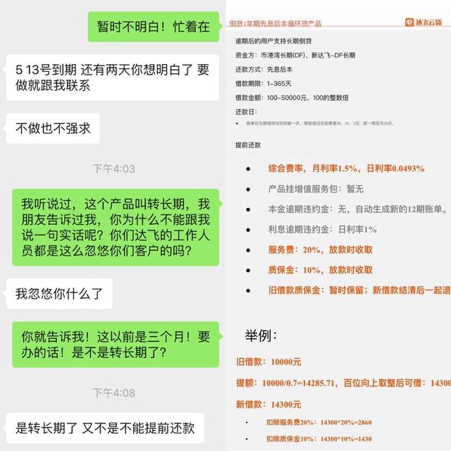 比倒贷更疯狂的,是达飞云贷推出的“逾期转长期”(也叫“转长期”)产品——将逾期债务人的旧债务作废,并签订新合同,将此前的借贷本息、违约罚息的总和作为新合同的本金。