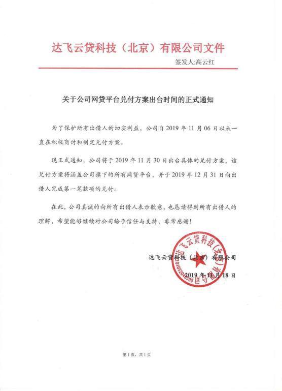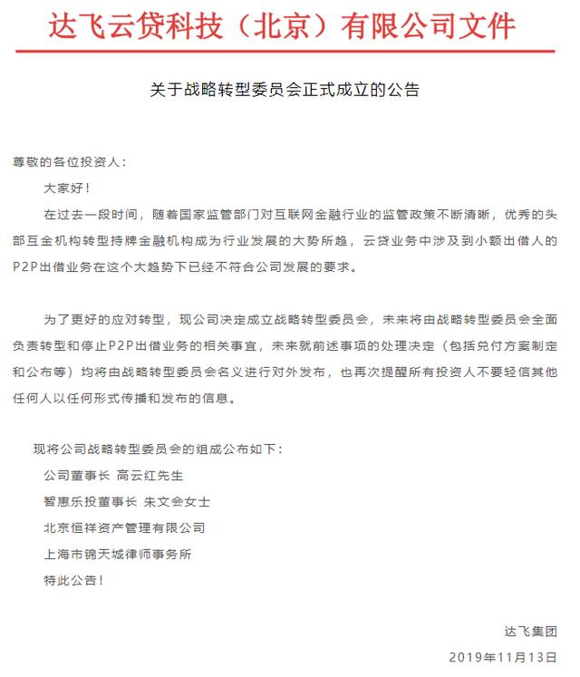 达飞云贷官方微信号2019年11月15日发布公告称,公司决定成立战略转型委员会,未来将由战略转型委员会全面负责转型和停止P2P出借业务的相关事宜。11月18日,达飞云贷又公告称自2019年11月6日以来一直商讨兑付方案,将于2019年11月30日出具兑付方案,并于2019年12月31日完成第一笔款项的兑付。