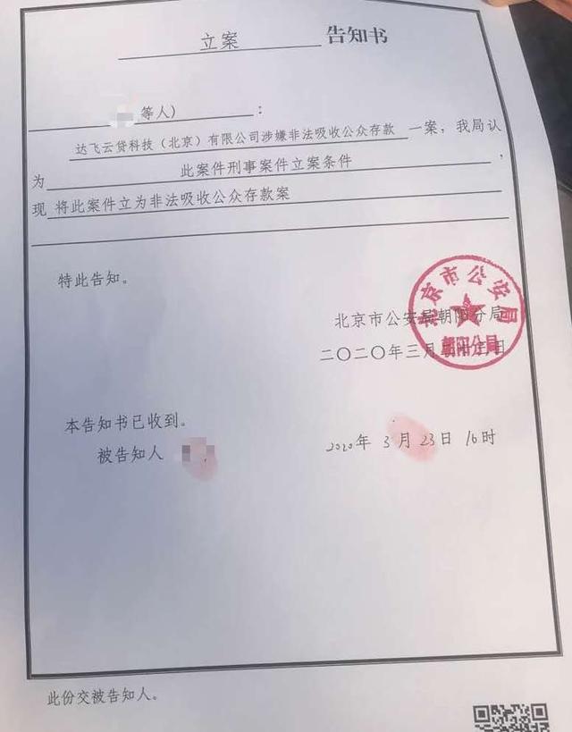 近日,《商学院》记者获得的一份立案告知书显示,3月23日,达飞云贷科技(北京)有限公司(下称“达飞云贷”)涉嫌非法吸收公众存款被立案,北京市公安局朝阳分局已给出立案告知书。