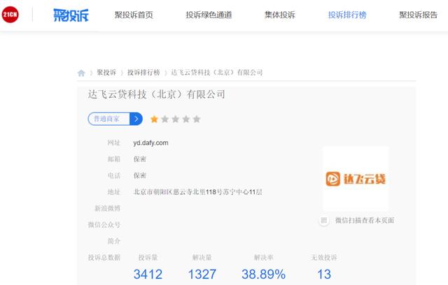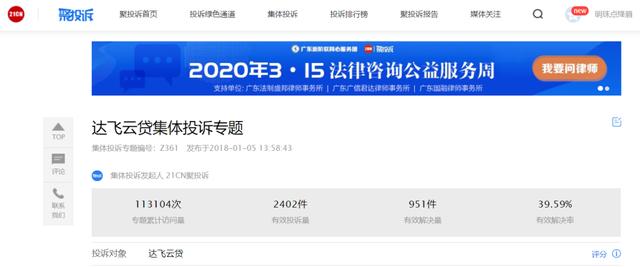 《商学院》记者注意到,在聚投诉平台上,2018年1月初,达飞云贷曾遭受千人联名投诉,集体投诉有效投诉量达2402件,专题累计访问量高达11.3万次。目前,在聚投诉平台上,达飞云贷的相关投诉贴达到3412条。
