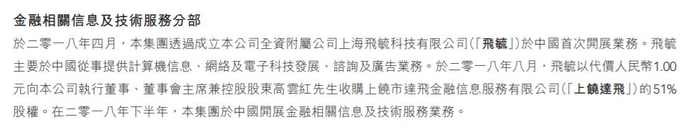 而据达飞控股2018年财报,高云红还为其执行董事、董事会主席兼控股股东。且早在2018年1月5日,高云红便已获任董事会执行董事、薪酬委员会、提名委员会等职位。直至2018年8月,高云红收购上饶市达飞金融信息服务有限公司(下称“上饶达飞”)51%股权,达飞控股才开始在国内开展金融相关信息及技术服务。