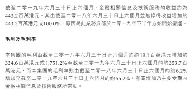 到2019年上半年,达飞控股金融相关信息及技术服务收益达到4.43亿港元。同时,由于该服务的带动,达飞控股毛利同比增长1751.2%,毛利率同比增长49%。
