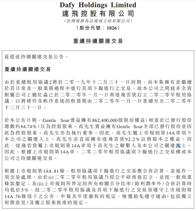 《商学院》记者了解到,此前的关联交易公告显示,达飞控股“间接非全资附属公司上饶红淼已于2020年1月1日与达飞云贷订立2020年租用协议,以将硬件及软件系统的租赁期重续至2020年12月31日。”