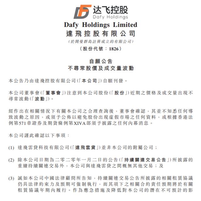 3月27日,达飞控股又公告称,达飞云贷并非其附属公司,且除2020年1月2日披露的重续持续关联交易外,达飞控股与达飞云贷之间概无其他交易。