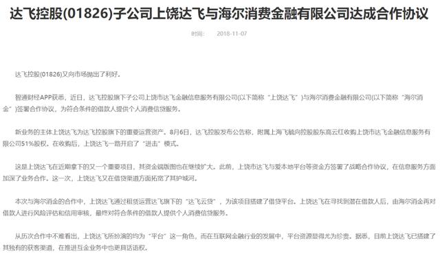 2018年8月,达飞控股上饶达飞开展金融相关信息及技术服务。而达飞控股官网披露,上饶达飞通过租赁运营达飞旗下的“达飞云贷”,寻找借款人,并由合作资金方进行评估审核及放款流程。
