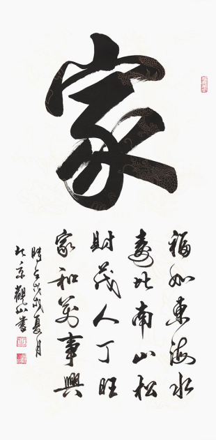 家庭是宁静的港湾,春风和煦,波澜不惊。而家庭的幸福美满,则需要我们在人生的航程中永远并肩前进。观山书法作品《家》下面搭配的小字“福如东海水,寿比南山松,财茂人丁旺,家和万事兴”,这四句话诠释了一个家庭的所有愿望。