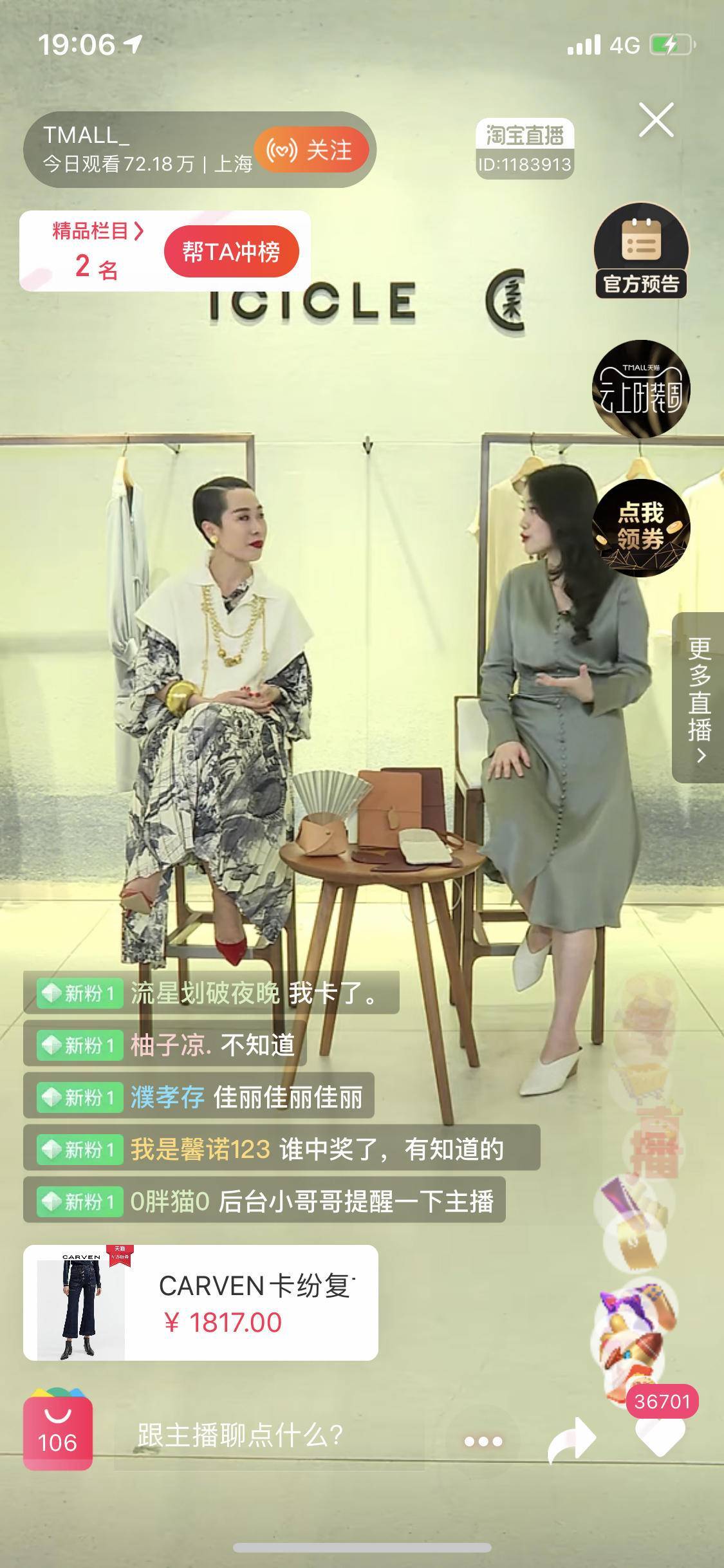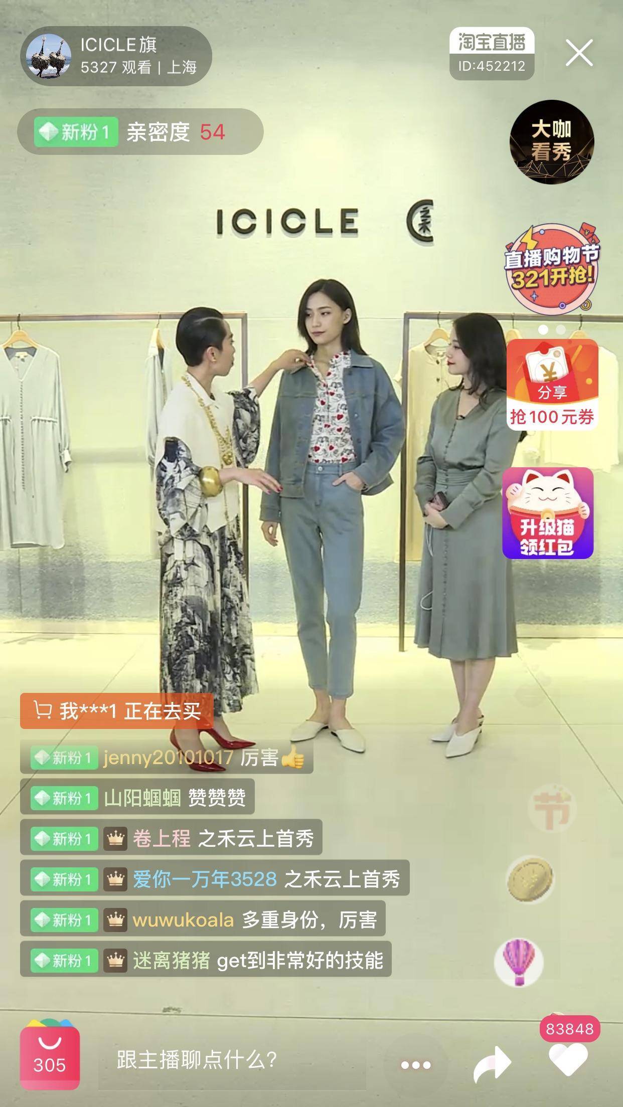 当晚ICICLE走秀尚未开始,品牌淘宝直播间内就开始有观众在评论区互动等待,直播开始7分钟品牌累积了逾一万次点赞数。在Tera-Feng与主持人交流ICICLE云上秀观感期间,由于观看人次过多、网络流量过大,导致直播出现了长时间断线或卡屏等意外情况。