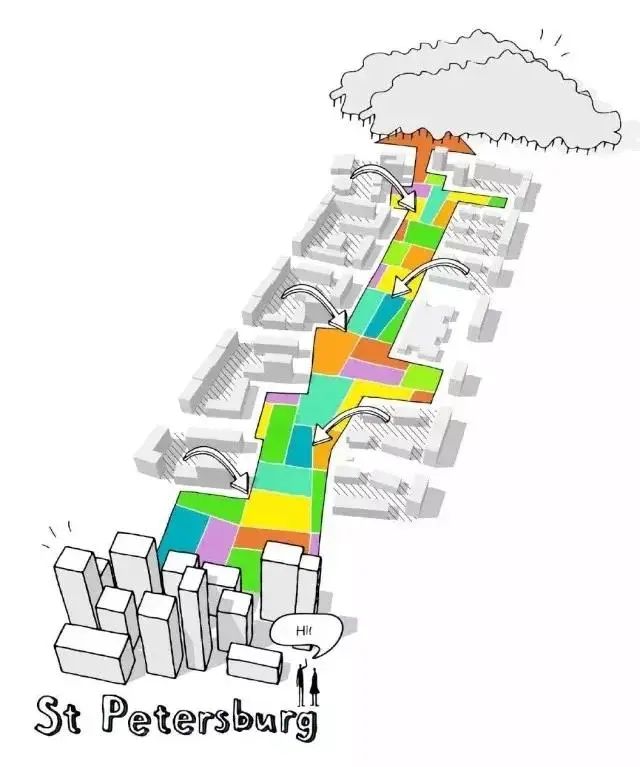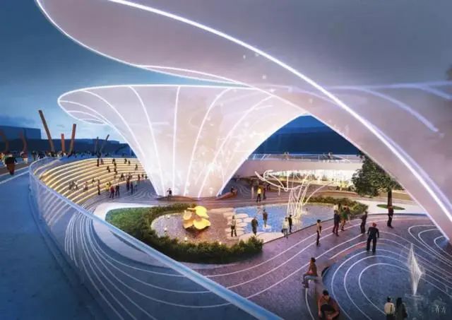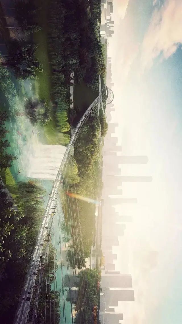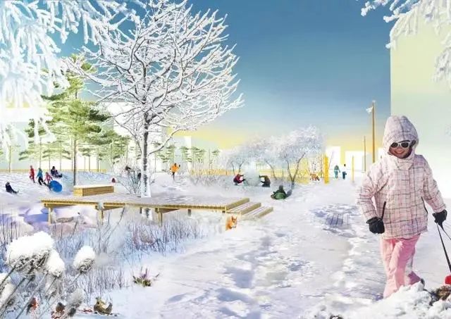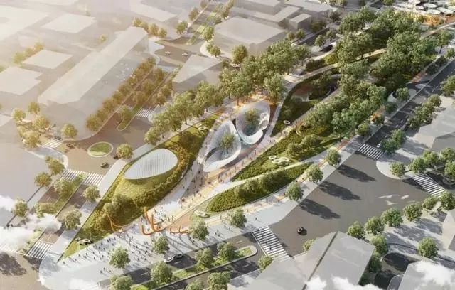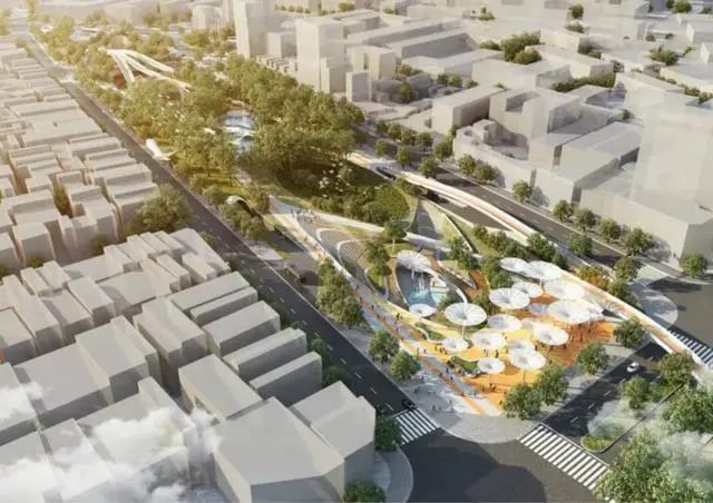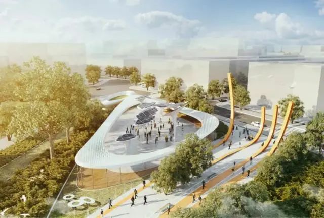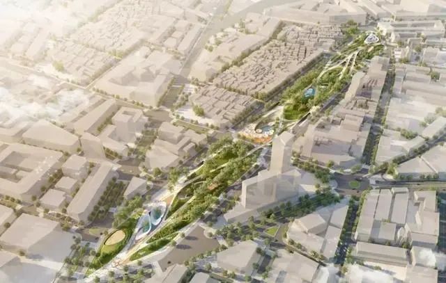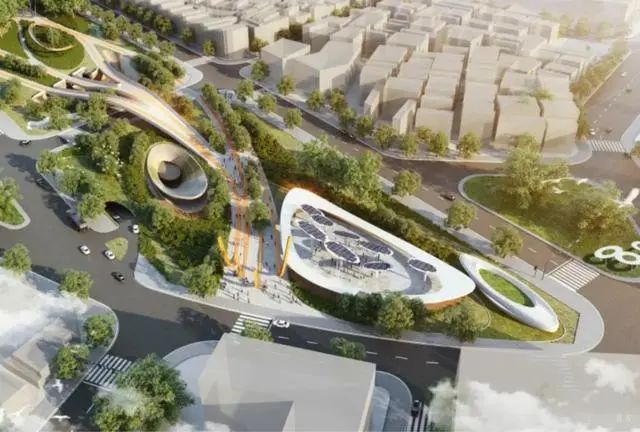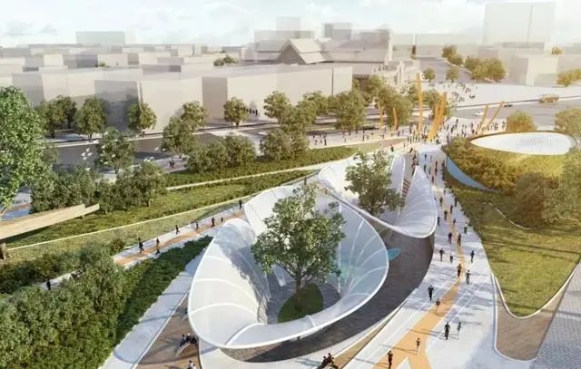 此外,设计方案参考了当地轨道交通的发展历程,摒弃了不友好的传统网络空间,形成了集休闲和连通功能为一体的新型多用途公共空间,涵盖雕塑花园、户外艺术画廊、露天剧院、溜冰公园、森林、瀑布和商业空间等。