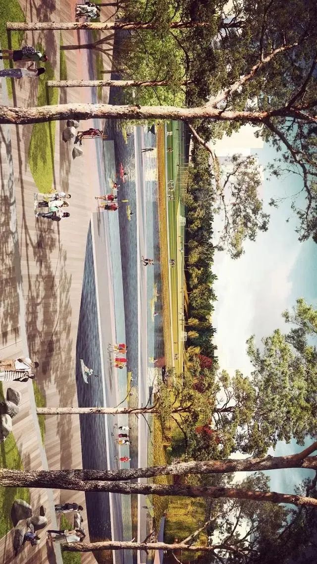 如何将零散的空间串联起来,设计师在公园周边衔接的地方加上了一些活动点,比如在西边道路边缘设计了一些广场,在东边跑道边上设计了一些木平台。