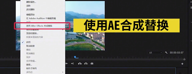 第一步:在PR工程里找到需要做跟踪的视频素材,选中后右击,选择在AE中合成替换
