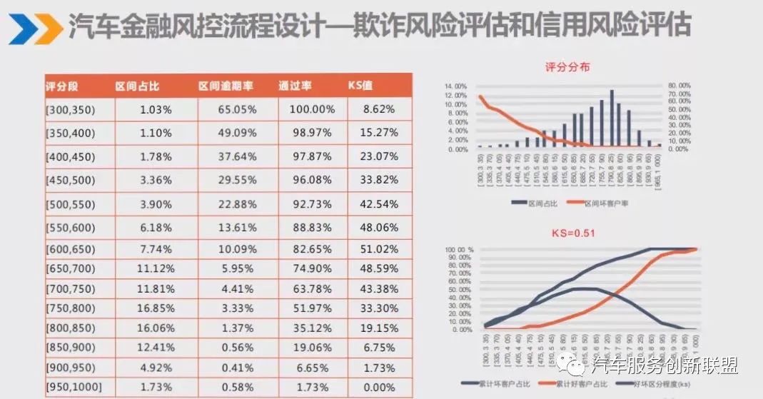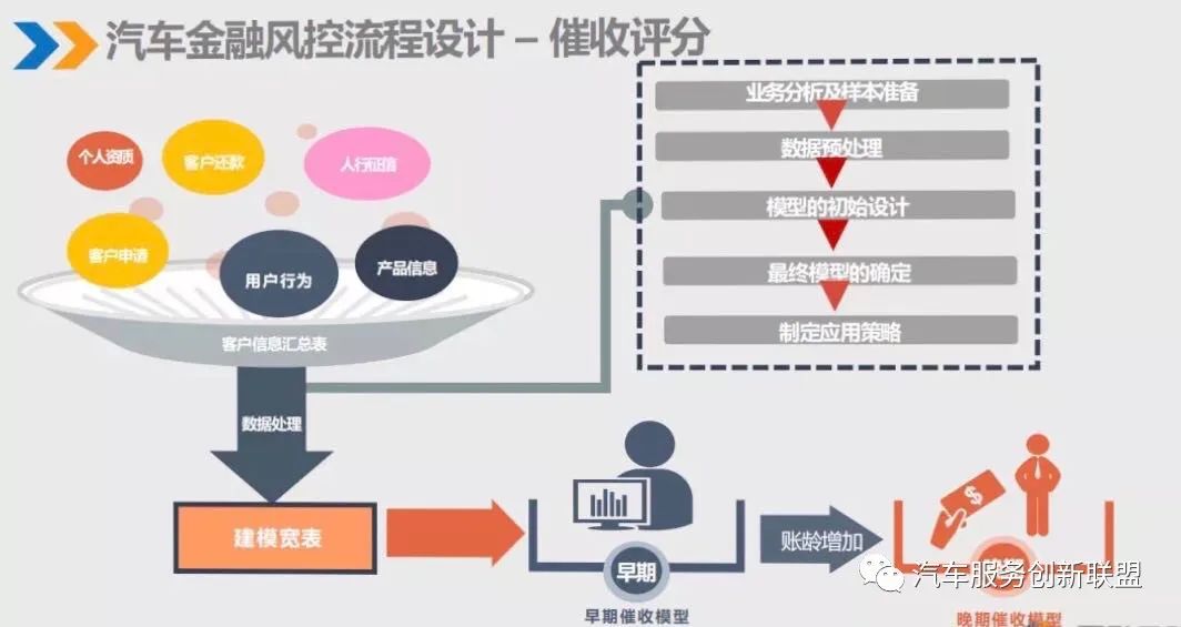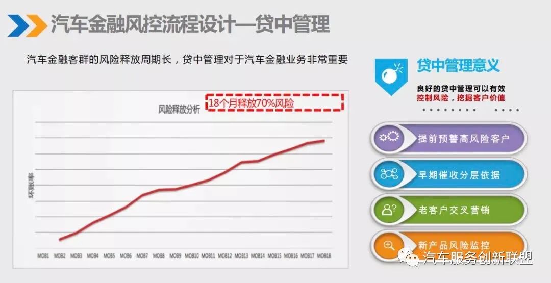 刚才讲的是贷前的环节,汽车金融和其他产品相比有个比较明显的特点,就是风险释放周期长,图中展示了大致的风险释放周期,我们可以看到过了18个月,也仅仅是释放了70%的风险。所以,这要求我们做好贷中监控的环节。需要及时监控客户的还款状况,还有信用风险的变化,以及偿还能力的变化,提前做好预警,或者催收前置。对于资质比较好的客户,我们可能会做一些存量的营销。