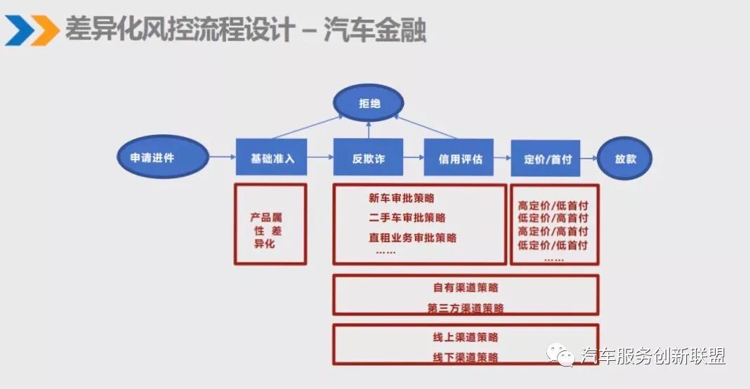 差异化风控流程设计,不止在汽车金融领域,在其他业务中也是一个重要的思路。为什么要做差异化审批?因为我们可以把整个风控流程看成一个评估的准则或者标准。对于不同客群,不可能使用同一套标准对他进行评估,通常会基于产品、场景、渠道上的差异对客群做划分,相对来说不同客群,他们的质量和风险特征是不一样的,需要我们在整个流程设计上做不同的分支,以及模型的搭建过程中,需要使用分客群来进行建模。