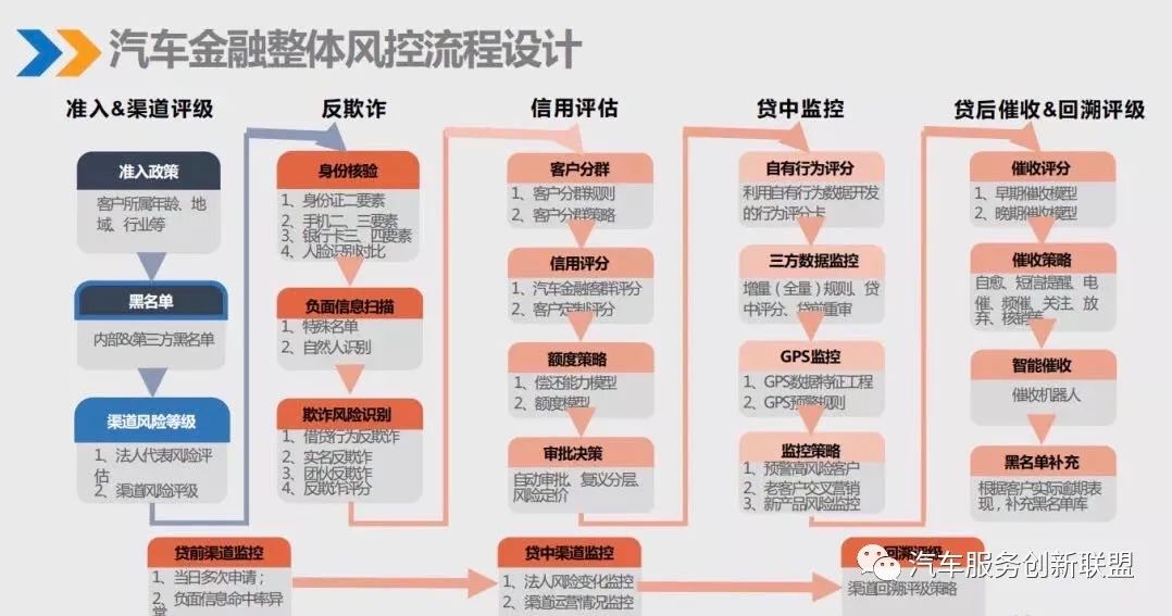 这张图就是我们在汽车金融整体风控的一个流程图,它覆盖了整个汽车金融生命周期的各个环节。大致分为五个环节:
