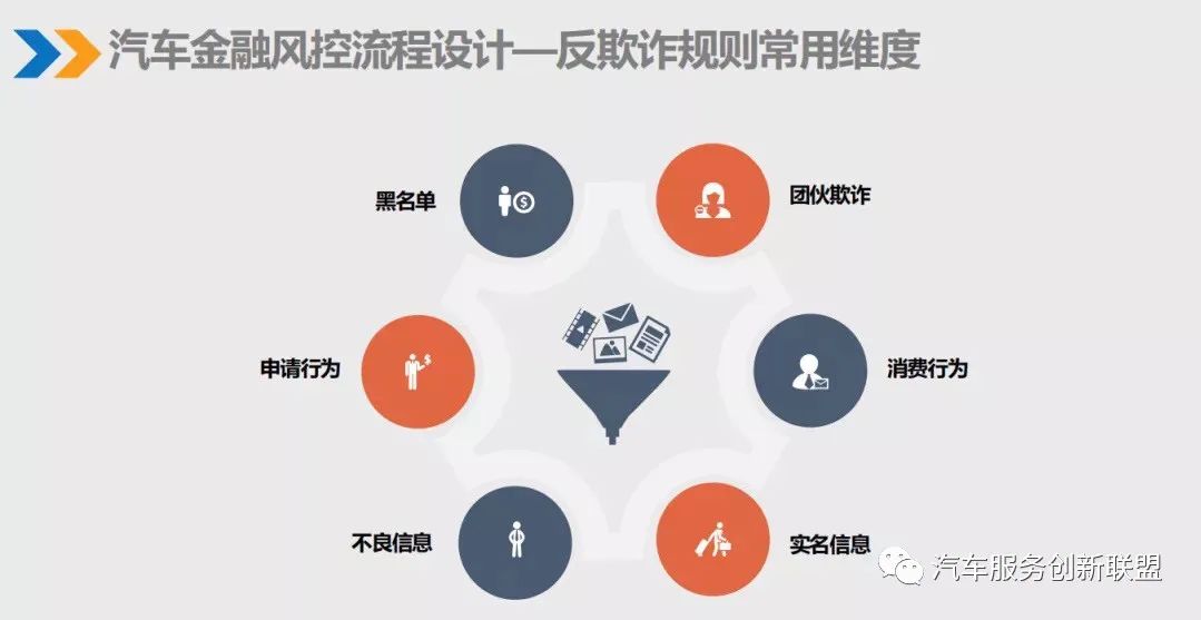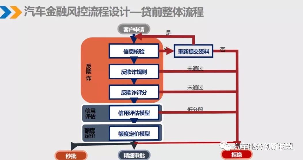 汽车金融风控流程设计中需要关注的五个节点:获客、反欺诈、信用评估、额度、利率,整个风控流程的设计一直是围绕这几个点来设计的。