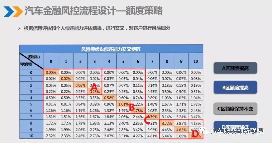 除了欺诈和信用风险评估,通常还会做额度的策略。通常会把信用的评估和个人的评估做一个交叉,对客户进行风险细分,图中左上角表示偿还能力强,信用风险低,右下角表示偿还能力差,这样可以把用户分为 A、B、C、D四个等级,A区的客户资质比较好,足够强的偿还能力,信用风险比较低,那么就会对这部分用户提高额度空间。对于最差的区间,会提高首付比,降低额度空间,这样就会提高违约的成本。