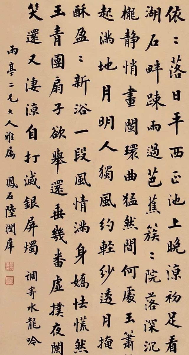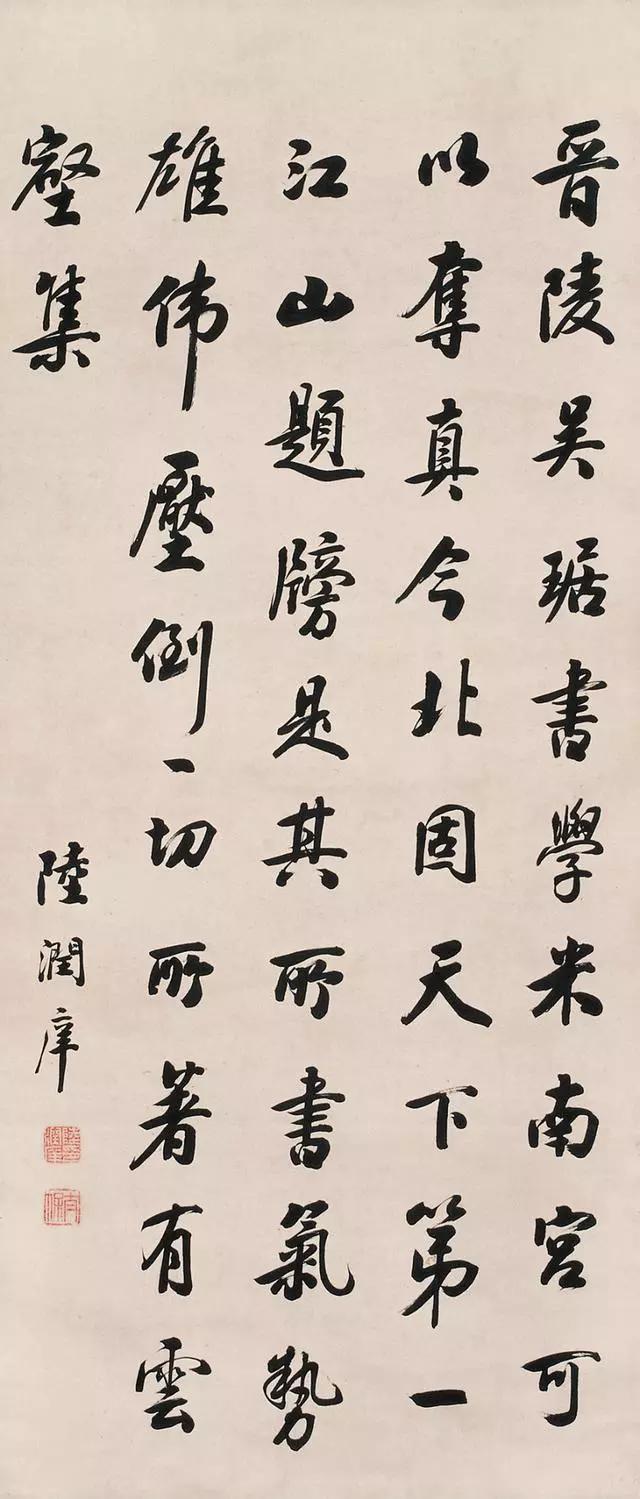 和清朝科举出身的其他书法家一样,陆润阳的书法馆阁气息较浓,讲究光黑精丽,匀圆丰满,大小一律的明、清官场书体尽管这种书体(馆阁体或称台阁体),为明、清最高统治者们所赏识(现故宫内布置或留存陆润庠书法不少),但都似乎缺少了一些笔墨的情趣和生动的韵味。